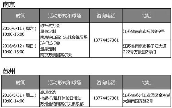 感谢您对 Titleist 产品的支持,以下是我们2016年6月份各地区的球杆试打体验活动、量身定制及高球优选活动安排,快来预约参与 Titleist 的活动吧!