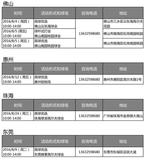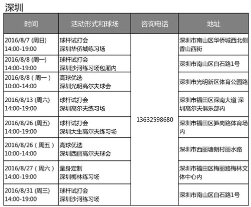 感谢您对 Titleist 产品的支持,以下是我们2016年8月份各地区的球杆试打体验活动、量身定制及高球优选活动安排,快来预约参与 Titleist 的活动吧! 如需更多信息,请根据您所在地区及下表内的咨询电话致电咨询。