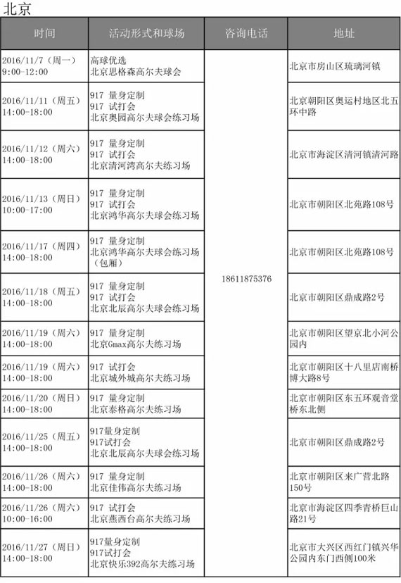 感谢您对 Titleist 产品的支持,以下是我们 2016年11月 各地区的球杆试打体验活动、量身定制及高球优选活动安排,快来预约参与 Titleist 的活动吧!
