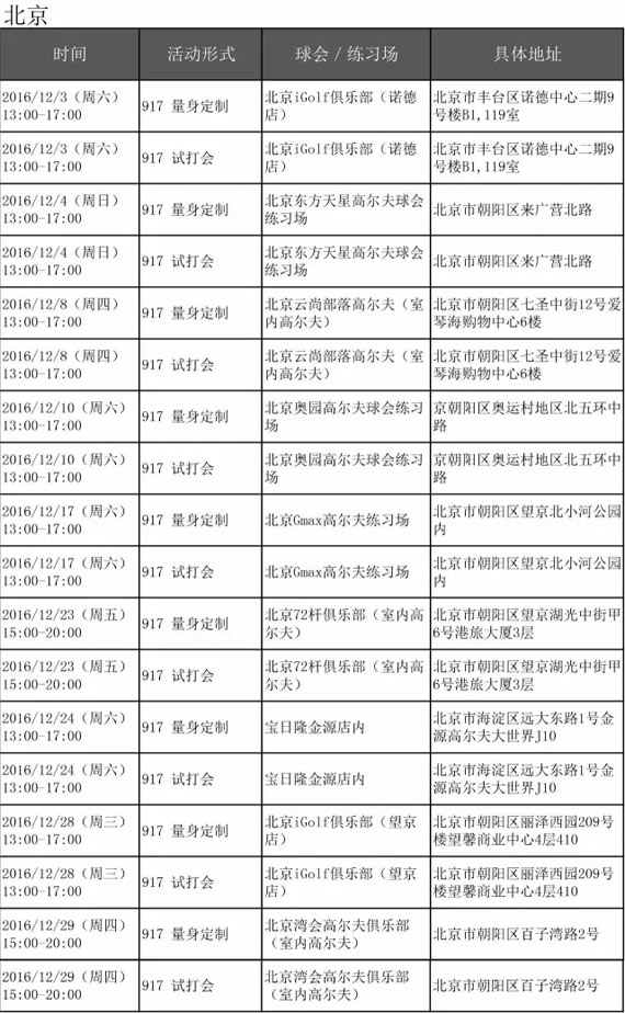 感谢您对 Titleist 产品的支持,以下是我们 2016年12月 各地区的球杆试打体验活动、量身定制及高球优选活动安排,快来预约参与 Titleist 的活动吧!