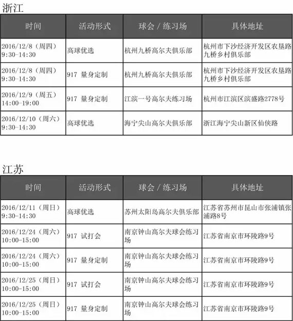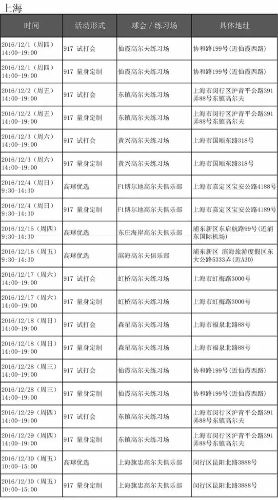 感谢您对 Titleist 产品的支持,以下是我们 2016年12月 各地区的球杆试打体验活动、量身定制及高球优选活动安排,快来预约参与 Titleist 的活动吧!