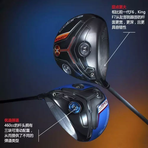 将新产品冠以“King”系列命名,一向是Cobra最重视的事。最新款F7和F7+ 1号木集成了智能科技,提供更佳的距离和容错性。King F7的甜美区空间比F6扩大了5%,这使得更多的偏心击球可以打中甜点。更大的冠部(由“TeXtreme”碳纤维制成)比以往轻了8克,同时升级后的底部加速槽配搭3块可移动配重(一块重12克,另外两块重2克),它们的位移组合产生不同的重心位置。最重的滑动配重放置于后方可以打出更高的弹道,具有更好的容错性;置于前方的弹道更低,更具穿透性,倒旋更少;或者置于跟部,产生小左飞的偏移。