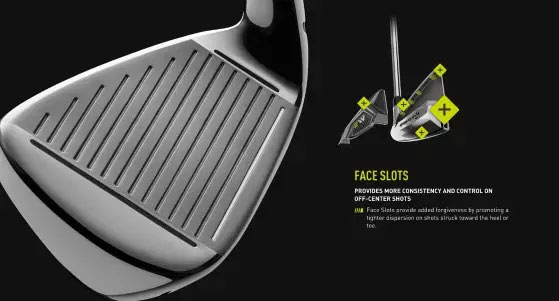 全新M2系列铁杆结合了薄壁加速槽,这种设计可以增加杆面灵活度,并当增加初始角度时保证了低杆面中心击球的球速。与过去的铁杆模型相比,在中长铁杆的加速槽上减少33%的前壁厚度是为了增加杆面位移的影响而设计。