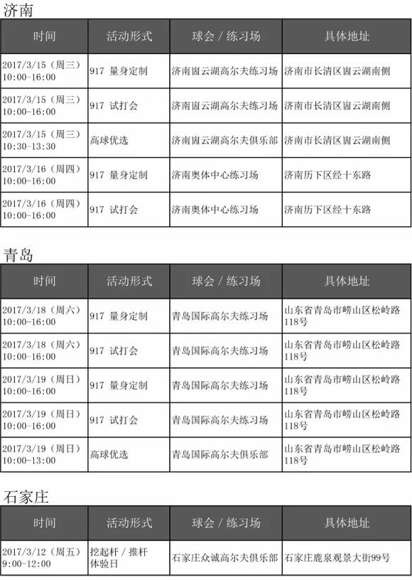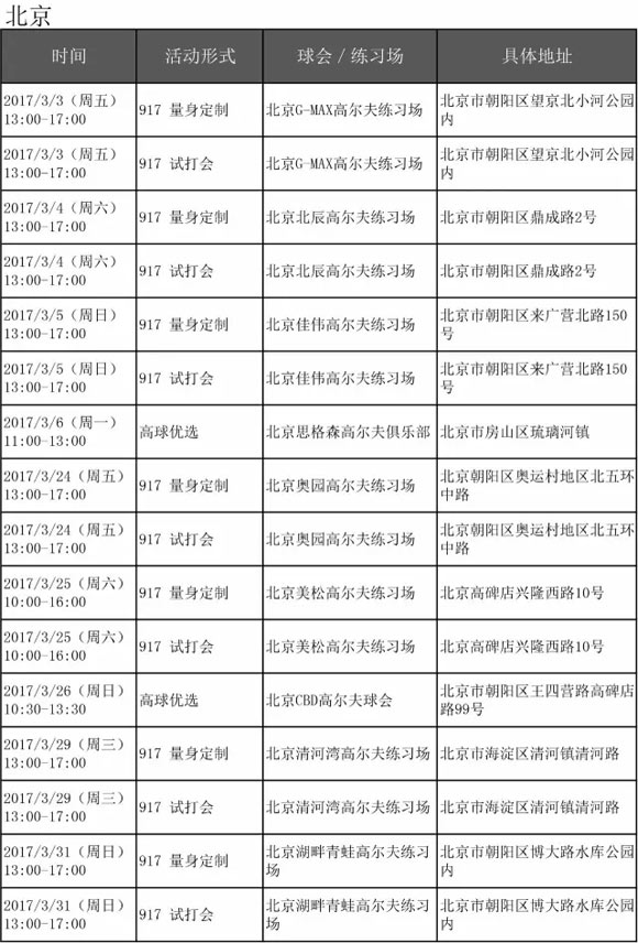 感谢您对 Titleist 产品的支持,以下是我们 2017年3月 各地区的球杆试打体验活动、量身定制及高球优选活动安排,快来预约参与 Titleist 的活动吧!