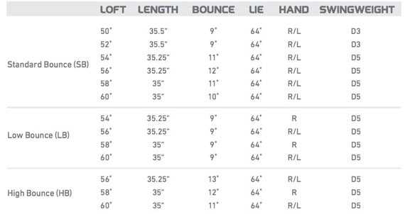 所有挖起杆对于杆面倾角和杆底/反弹角都会提供多样化的选择,Milled Grind挖起杆也不例外。下面的图表提供了全部的选择范围,其中包括“C”型后部缓解的低反弹角(LB)、用以开放式击球时趾部缓解切面的标准反弹角(SB)以及配备可增加杆底升力的宽弧度杆底的高反弹角(HB)。