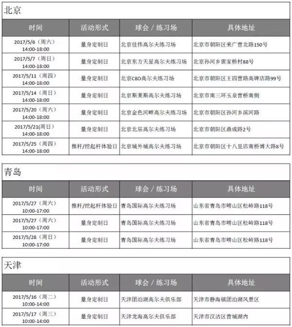 感谢您对 Titleist 产品一如既往的支持,以下是2017年5月各地区的球杆试打体验、量身定制活动安排,快来预约参加。定制专属您的 Titleist 球杆吧!