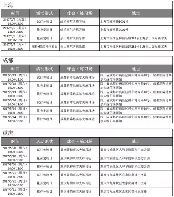 感谢您对 Titleist 产品一如既往的支持,以下是2017年5月各地区的球杆试打体验、量身定制活动安排,快来预约参加。定制专属您的 Titleist 球杆吧!