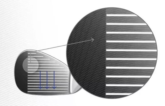 3个创新带来更稳定且最大的旋转量,新“Tour Zip Grooves™”为了在任何环境下都能有更好的触球,击球面凹槽设计成更深更窄的U字型,所有角度型号挖起杆的边缘更锋利。两种不同的镭射雕刻纹路可增加摩擦,随击球面倾斜角的不同,纹路的方向也有所不同。低角度挖起杆(48°- 52°)为笔直纹路,适应所有挥杆。高角度挖起杆(54°- 60°)为带有角度的纹路,适合打开击球面的挥杆。激光镭射雕刻在符合规则的情况下,把击球面表面最大限度精密雕刻成增加摩擦的粗糙表面。