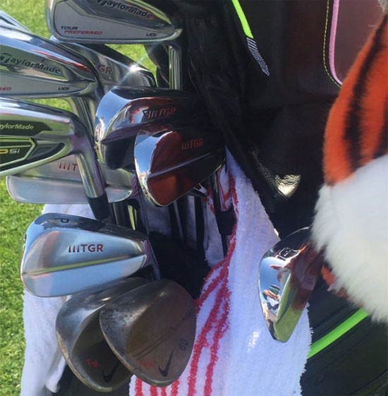 在这次教学活动中,伍兹的球包也被拍了下来,其中包括了一些更老的耐克挖起杆、两支之前发布的泰勒梅铁杆(Tour Preferred和Psi),然而最吸引人注意的是,伍兹个人带有“TGR”LOGO的新铁杆。