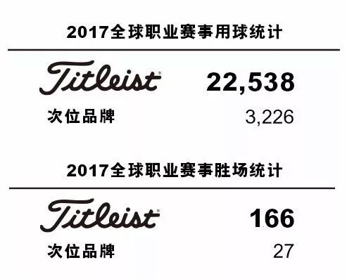 在 2017 全球职业赛事胜场中,Titleist 获得了 166 场胜利,超出次位品牌(27 场)6 倍有余。