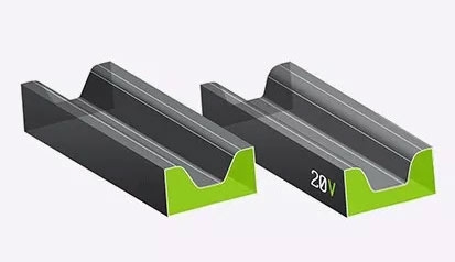根据上图,我们可以发现:相比普通沟槽的设计,20V沟槽更宽、更深。这种设计能够提高控制性,并且能够在各种击球环境下提供优异的倒旋,尤其是在长草击球的时候,过草性能有了显著的提高。