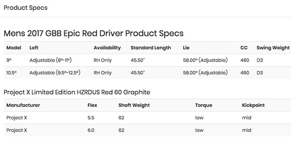 以下是卡拉威官网提供的卡拉威 GBB Epic红色一号木的规格参数