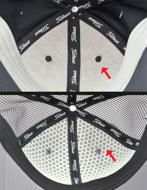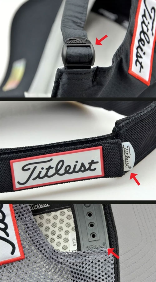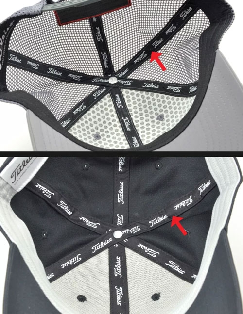 查看配件细节。有问题的球帽,往往只是一顶普通的帽子,绣上 LOGO 而已。Titleist 的真品球帽,则会统一使用同样精细做工的配件或配料,包括印有 Titleist Logo 的帽内顶三根结构带;