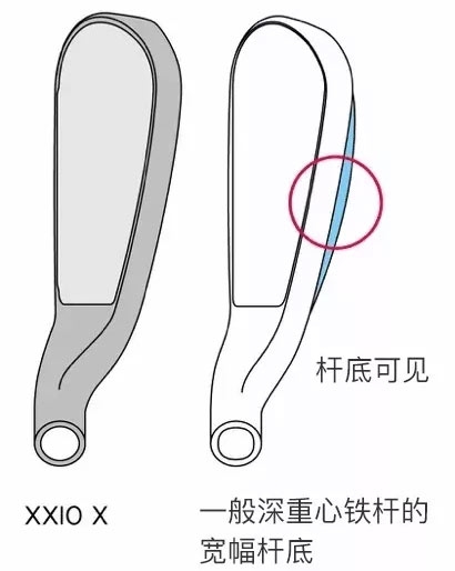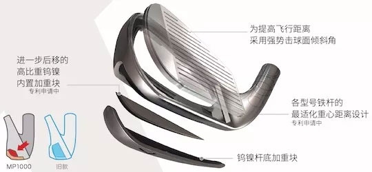 各型号杆头不同厚度设计。偏重操控性能的H5的杆头壁厚在没有改变的同时加大惯性矩,获取稳定的飞行距离和方向,提高了2.5码飞行距离。XXIO MP1000多功能杆是一款着重设计且有不同型号的球杆。
