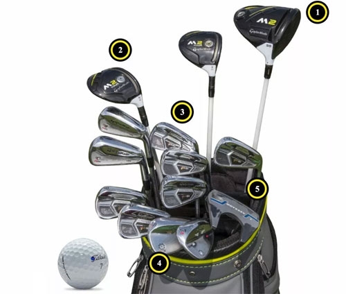 TaylorMade M2 Tour,3号木(15°),配备Aldila Rogue Limited Edition 70碳素杆身,硬度TX,平均距离275码;5号木(18°),配备Aldila Rogue Limited Edition 80碳素杆身,硬度TX,平均距离255码。