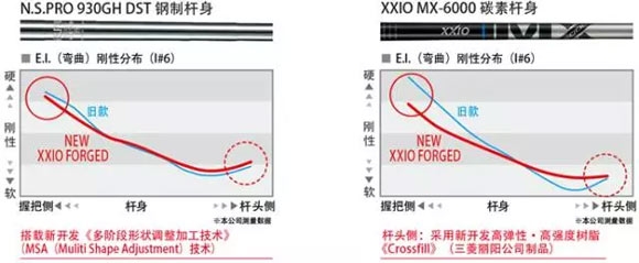 专门为XXIO FORGED 6铁杆而设计的MX6000碳素杆身,相比旧款重量减轻1g,重心移向握把侧移30mm(钢杆身侧移12mm),减小球杆惯性矩、提高球头速度。