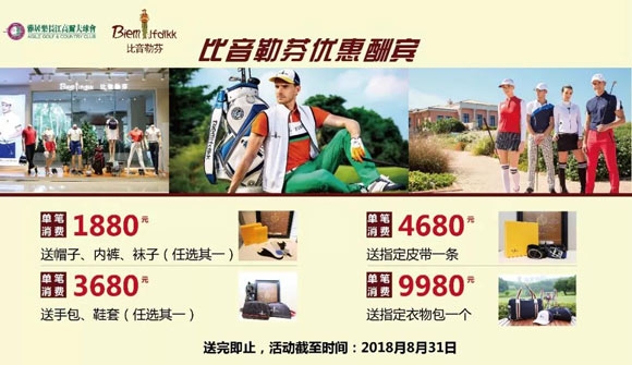比音勒芬2018的春夏新品已出炉,喜欢用比音勒芬的朋友们有福气啦!雅居乐中山长江高尔夫球会专卖店将在近日更新比音勒芬当季的新品,而且消费满一定的金额,可以获赠礼品哦!详情见下面。