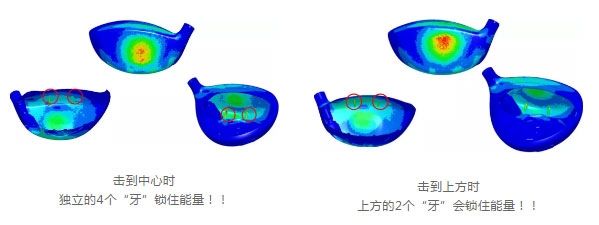 使人联想到牙的肋条分布在杆面内4处。通过提高杆面周围的刚性,更大范围地提升杆面的反弹从而增加初速。可以减轻低重心设计的型号所特有的击到上方会出现的drop现象。