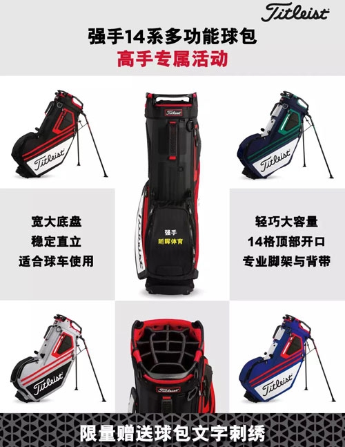 购买Titleist 强手14系多功能球包,限量赠送球包文字刺绣。