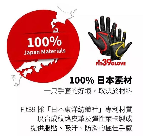 一只手套的好坏,取决于材料。Fit39採用日本东洋纺织社的专利材质,以合成纹路皮革及弹性莱卡制成,提供服贴、吸汗、防滑的极佳手感。