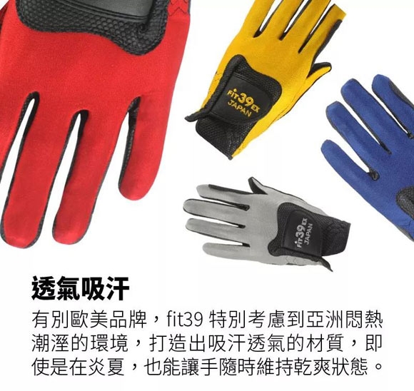 *吸汗:有别欧美品牌,Fit39特别考虑到亚洲闷热潮溼的环境,打造出吸汗透气的材质,即使是在炎夏,也能让手随时维持干爽状态。