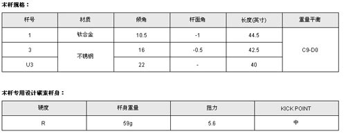 ·配置:1#木杆+3号球道木+U3铁木杆+7支铁杆(5-9、PW、SW)+推杆 ·钛合金杆头开球木杆,打感更佳。 ·4500CC大杆头,更大的容错性及更强的安心感。 ·配备有万能,轻松提高打球成绩。