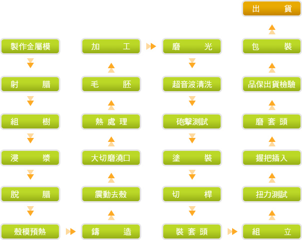模具制作 → 射 腊 → 修 腊 → 组 树 → 浸 浆 → 脱 腊 → 铸 造 → 切断打砂 → 热处理 → 毛胚检验 → 修 整 → (复合材质压入、焊接或碳纤材质内吹、贴合) → 加 工 → 研 磨 → 涂 装 → 球头成品装箱(或组立后球具出货)