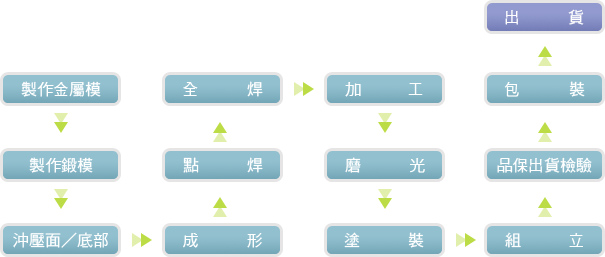 模具制作 → 锻件生产 → (外购锻件) →锻件检验 → 修 整 → 锻件组配 →(复合材质压入、焊接或碳纤材质内吹、贴合) → 加 工 →研 磨→ 涂 装 →球头成品装箱(或组立后球具出货)
