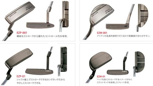其中EZP-001和EZM-001是追求简单易打的普及型款式设计,长杆颈便于瞄球,倾斜杆颈实现低轨道击球;EZP-01和EZM-01采用浅褐黄色电镀设计,采用整块软铁加工而成,实现优越的操控性,更易掌握击球距离。