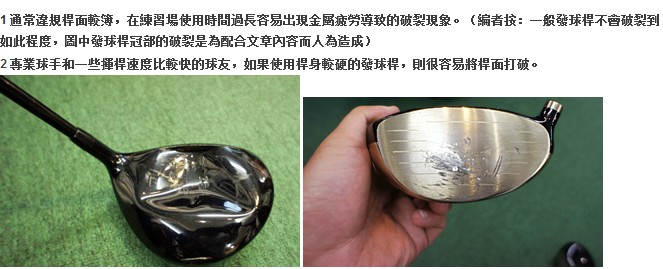 另外,杆面破裂的问题亦会出现。如果你想发球杆杆面保护好一些就不要在练习场练习太长时间。因为违规杆面簿容易出现金属疲劳导致破裂。时下也渐渐出现一些TOUR ISSUE和TOUR PROTOTYPE的球杆,它们都是用质量好的钛金属及杆面厚度平均材料制成,所以能够经受挥杆速度快的球手使用。从前专为职业球手打造的球杆,现在普通球友亦可买到,对高水平球友来说确实是一个好消息。