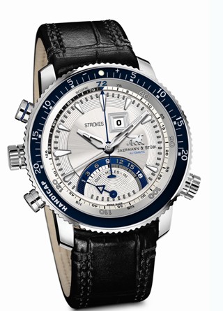Jaermann & Stübi “Hole in One” 系列把已成功研发的高尔夫球累计杆数显示简化,利用转盘系统把每洞杆数显示于大型显示窗。此型号命名的灵感除了因为此乃每一位高尔夫球员的目标外,亦是因为表盘上的唯一显示窗。全新腕表可显示每洞杆数,中央指针显示总得分,而重新设计的可旋转表圈可比较每局的让杆差点 (Handicap comparison),6时位置的逆行指针则显示现时比赛中的洞数。与所有Jaermann & Stübi腕表一样,“Hole in One” 亦配备了防震系统功能。