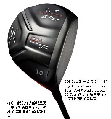 Tour Edge公司生产的Exotics系列1号木一向以优异的表现给人惊喜,其最新推出的CB4一经面市就受到了广泛关注。这款以“杆身最长”“倒旋最少”作为宣传口号的1号木具有相对典雅的外观,通常情况下,它较小的杆面和较长的杆身更适合低差点和挥杆速度较快的球手。