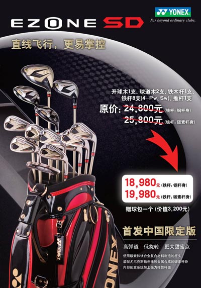为回馈两年多来中国球友对尤尼克斯高尔夫的支持,今季,尤尼克斯高尔夫推出套杆促进季活动,三个系列:首款针对中国球友推出的EZONE SD系列,皇家版Royal EZONE系列, 和女杆系列EZONE Fiore 都将以实惠的价格回馈顾客。
