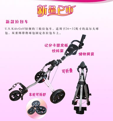 U.S. Kids Golf 轻便的三轮拉包车,适用于26~32英寸的高尔夫球包,双重绑带将球包固定在拉包车上。 特点:轻便设计;泡棉垫手柄;可折叠,易储存;配有记分卡固定板及储物网袋;饮料架 ;车轮可拆卸 ;适用于26~32英寸的高尔夫球包。