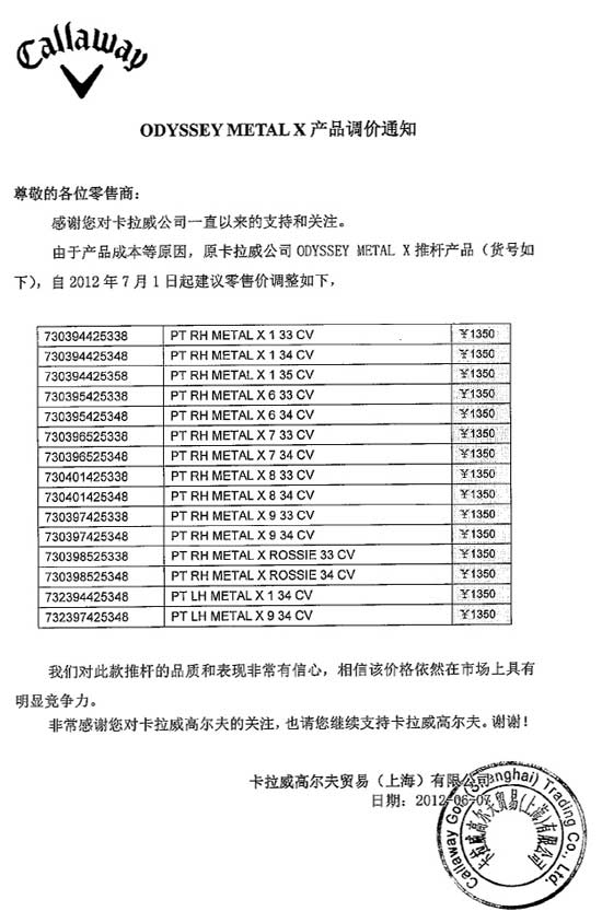 Odyssey Metal X 高尔夫推杆产品调价通知