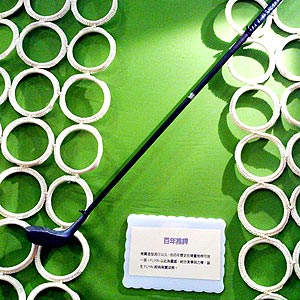 现场所展示的骨董球具中,有来自英国圣安卓球场(ST. ANDRAWS, SCOTLAND)的推杆,其为藤制杆身,已有上百年历史,而另一枝不锈钢杆身木杆,无论球头与握把皆非常精致,品相完美,是为高尔夫木杆极品。