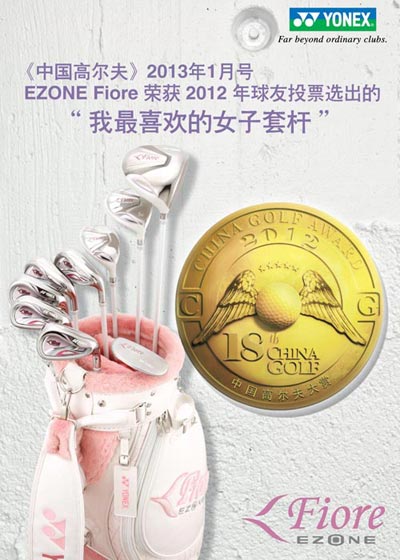 在刚刚过去的2012年《中国高尔夫》杂志举行的票选中,YONEX EZONE Fiore女杆被评选为2012年度“我最喜爱的女子套杆。”