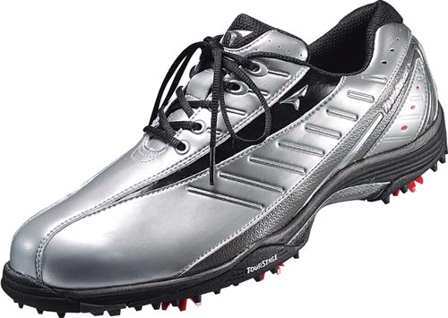 轻盈-采用人工皮革及合成树脂鞋底;重量只有360克,令你的挥捍更加称心如意, 加上螺旋形的鞋钉,有助球手挥杆时保持稳定。
