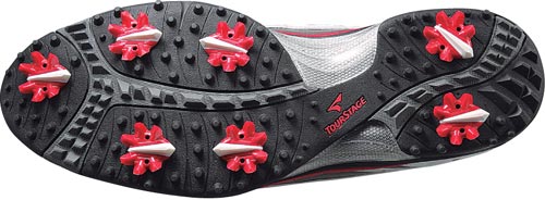 咬地- 新设计的鞋底采用向外延伸的纹路以及鞋边,大大提高咬地能力。加上全胶粒鞋底,有助球手挥杆时保持稳定。