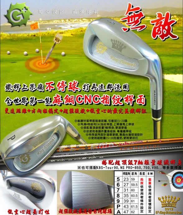 但天下无难事只怕有心人,我们G+品牌的研发精神就是成本无上限才能做出,性能超越所有国际大品牌的球杆,只有大幅突破现有的制作条件限制,才能将球杆做到没有对手的境界,上一篇结尾时有说到G+-2012年新研发的球具都会大幅超越目前代工厂制作上限制,没有去尝试怎么知道能不能突破,让球具更进步G+-木杆系列能入围全世界最大的[IF]产品设计大奖就是对我们不断创新研发的肯定,也让我们全心投入研发各种无敌的球具,G+-(无敌)King-铁杆组就是2012新产品的第一炮,接下来还会陆续推出更强的G+-King(无敌)系列球具,