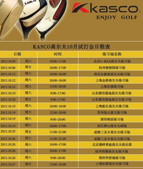 秋高气爽之际,KASCO 高尔夫10月份试打会款款而来,让您在练习场上意气风发、酣畅淋漓,赚足试打的瘾。天时地利人和,KASCO高尔夫10月试打之约,您岂能错过?