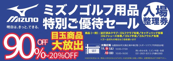 11月9日至10日,美津浓高尔夫将在上海仙霞路88号太阳广场中栋2楼举办特卖会(时间:11月9日 10:00-17:00、11月10日 10:00-16:00),时间有限,特惠商品欢迎选购!