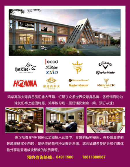 鸿华高尔夫球具名品汇地处北京朝阳区北四环北苑路,属亚奥核心市区,交通极为便利。各大世界顶级球具品牌汇聚于此,至此打球佳季,各球具品牌商均为球友们奉上超值特惠活动,赶紧来乐购吧! 鸿华练习场一层旺铺仅剩余一间,预订从速! 热线电话:64911581 13811388587