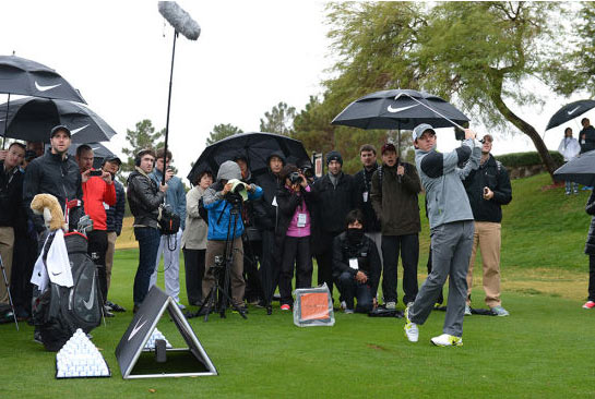 神秘嘉宾麦克罗伊对新品的讲解和示范在拉斯维加斯低温、中雨的四级阵风中进行。每次击球前,他必须不停地擦干握把和杆面上的雨水。沙漠城市竟然用反常的“恶劣苛刻”天气考验他们用将近一年时间的磨合成果。