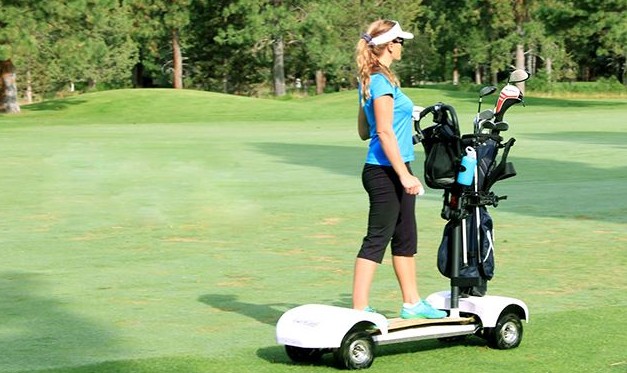 这款高尔夫球新玩意近日首次亮相加州一场慈善高尔夫球赛上,它结合将传统高尔夫球车和滑板巧妙结合在一起,以电动形式驱动滑板车前进,可载重110公斤,最高时速达19公里,造价3500美元(折合约2万人民币)。