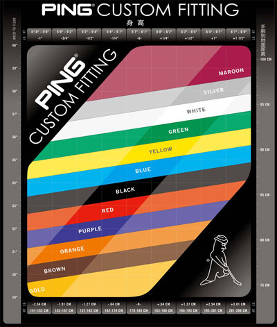也许很多球友对底角的概念很不清楚,以为每个人使用的球杆,除了品牌和杆身其他都是一样的,其实不然。底角是球杆正常停放时,杆头底部和杆身中心线所构成的角度。经过30万以上人次的测试,PING将用12个不同的颜色代替底角,也就是说每个颜色代表一种度数的底角,PING叫做色点,这就是PING著名的色码表系统。