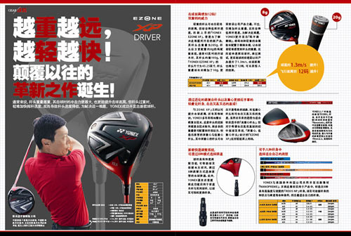 较重的杆头可击出较远的距离,但却会降低挥杆速度。而新上市的「YONEXEZONE XP」,便是为了解决此难题所开发的新产品。其杆头总重量为205g,杆头后方更配置约8g的钨配重系统。通常45英吋的开球木杆,其杆头约重195g。但「YONEX EZONE XP」的杆头尺寸为45.25英寸,杆头重量却足足增加了10g,更荣登该公司产品之最。不过,仅增加杆头重量,反而会降低挥杆速度。为解决此难题,YONEX更开发出「钨平衡握柄」,将钨这种较重的金属粉末配置于握柄末端,让击球者较难感受到杆头的重量,反而能快速挥动球杆。透过测试,更发现球的初速较以往产品提升了1.3m/s,击球距离也增加了12码,可见其惊人的效果。