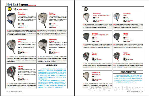 在亚洲市场上,流行着很多在欧美没有或者很罕见的品牌,比如Honma、比如XXIO、比如PRGR …… 有些大牌球具公司更是会专为亚洲市场生产部分款型的球杆,比如TaylorMade Gloire Reserve、Callaway LEGACY、Titleist VG3 ……面对这样的局面,从2012年起,Golf Digest日本版(GDO)效仿美国Golf Digest “球具热力榜(HOT LIST)”,启动了“日规球具热力榜”,通过各界高尔夫专业人士的测评,评选出评选出获得金奖和银奖的产品。2014年,“日规球具热力榜” 来到了第三届,参与测评的包括27个球具商提供的254支球杆。继去年后,《高尔夫大师》再次将最新一期“日规球具热力榜” 引进到中国,希望帮助国内球友了解到哪些日规球杆性能优良,又应该选哪一支。