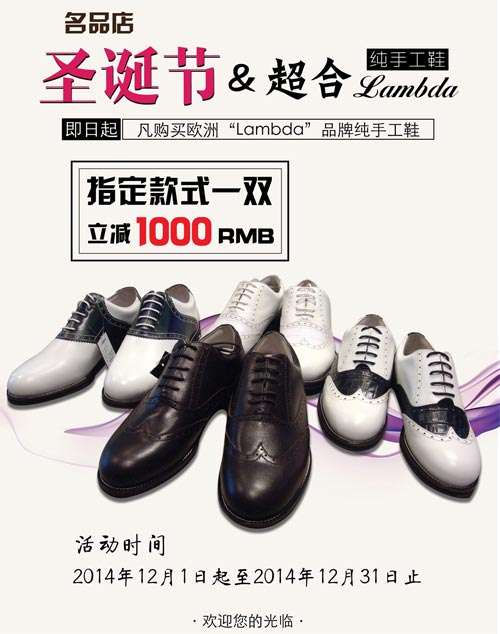 西海岸高尔夫球会-专卖店优惠大放送!凡购买欧洲“LAMBDA”品牌纯手工鞋指定款式一双,立减1000元。 活动时间:2014年12月1日起至2014年12月31日止。 西海岸高尔夫球会欢迎您的光临! 详询:0898-68703186; 68703180