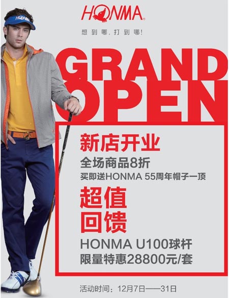 全球顶级高尔夫品牌HONMA开业钜献 全场8折!